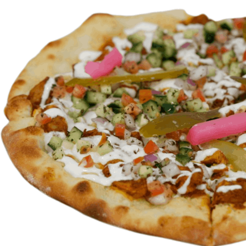 Embark on a culinary adventure with The Wedgeman's Chicken Shawarma Pizza, a delicious fusion of Mediterranean and Italian flavors. We start with a creamy, homemade garlic sauce, infused with fragrant herbs and spices. Then we layer on a generous portion of our premium mozzarella blend, followed by a symphony of authentic shawarma toppings